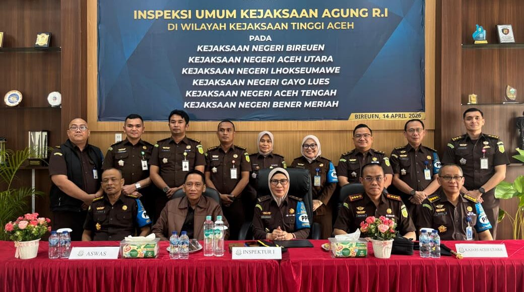Lhoksukon, 14 April 2026 – Kejaksaan Negeri Aceh Utara mengikuti rangkaian kegiatan Inspeksi Umum yang dilaksanakan oleh Tim Inspeksi Kejaksaan Agung Republik Indonesia di Kejaksaan Negeri Bireun, Selasa (14/4/2026). Kegiatan ini dipimpin langsung oleh Inspektur I pada Jaksa Agung Muda Pengawasan, Ibu Enen Saribanon, S.H., M.H., dalam rangka pengawasan internal terhadap satuan kerja di wilayah hukum Kejaksaan Tinggi Aceh periode 13–17 April 2026.